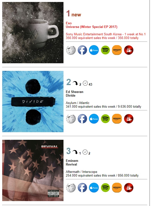 L'album Revival di Eminem passa dalla prima posizione alla posizione numero tre, superato dagli album “Universe” di Exo e “Divide” di Ed Sheeran.