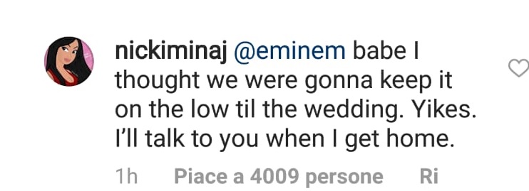Ecco il commento di Eminem al post di Nicki Minaj in cui lei afferma di aver intrapreso una relazione con il rapper.