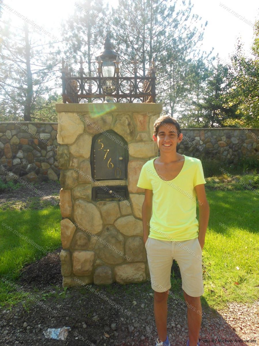 Ore 13:30: ci troviamo in un strada molto grande, ai lati viali con moltissime villette curate, la parola sporco lì non esiste. All’improvviso ci troviamo in un incrocio, guardandoci intorno vediamo spazi enormi , stradoni, prati ecc. Alla destra dell’incrocio però potevamo intravedere una strada con degli alberi enormi che si affollavano sulla via principale: il navigatore ci indicava proprio quella strada. Sul navigatore leggevo che mancavano 15 minuti all’arrivo, il mio cuore batteva a mille , ancora non ci credevo! Entriamo in questo viale e d’improvviso vediamo che la strada si fa sempre più stretta, ci accorgiamo che dopo questa strada a destra troviamo solo un bosco e a sinistra delle casette… ormai era da un’ora che non vedevamo più una persona in strada! Decidiamo di proseguire verso il viale con le casette fino a quando il navigatore non ci indica di svoltare a destra, su per un ponte strettissimo. A quel punto tutti pensavano di aver sbagliato strada perché davvero la zona sembrava disabitata ma…ho voluto proseguire! Attraversato il ponte, ci ritroviamo su una strada strettissima dove gli alberi che si trovavano ai lati arrivavano con i propri rami sulla strada…sembrava un miscuglio tra deserto e bosco. Decidiamo di proseguire per questa strada infinita e all’improvviso alla sinistra vediamo un’ enorme villa con il cancello aperto, e, si scorgevano subito delle lussuosissime macchine sempre con la grossa D di Detroit stampata sui vetri. Dopo quella villa abbiamo proseguito per un centinaio di metri fino a quando non vediamo delle mura, alte, possenti…ebbene si, erano le mura della casa di Eminem! Proseguiamo per una decina di metri, vedo un muretto…mi avvicino ma, era solamente la casella postale; subito dopo un cancello nero…c’eravamo riusciti, eravamo arrivati fino alla villa di Marshall! Il cuore mi si ferma per un attimo, ho dovuto far appello a tutta la mia forza di volontà per riuscire ad uscire dalla macchina: volevo vedere attraverso il cancello per scorgere il più piccolo dettaglio di quell’enorme villa ma, non faccio altro che vedere una casetta fatta apposta per la guardia con tanto di telecamere per il lunghissimo muro! Sono riuscito solamente a mettere la testa nel cancello per guardarmi un po’ in giro e ho visto un fantastico lago alla sinistra, di fronte un viale abbastanza lungo che arrivava ad una porta con delle scale molto larghe: era l’entrata principale della villa. A destra invece c’era questa casetta per la guardia e all’esterno ben sette bidoni dell’ immondizia. Fuori trovavi cartelli di tutti i tipi: “Attento ai cani”,” Area videosorvegliata”, “Proprietà Privata” ecc.. Oltre ai cartelli mi accorsi che si poteva bussare digitando dei codici…ovviamente la prima cosa da fare era digitare la data di nascita di Hailie ma… non ha funzionato! A quel punto ho deciso di provare ad aprire la casella postale, lo spazio per la posta era enorme ma all’interno ho solo trovato un giornaletto per villette! Niente di così rilevante! Infine ho voluto dare uno sguardo all’interno, salendo sul cancello, bel panorama, giusto per fare un paio di foto e godermi quei ultimi momenti bellissimi. Mi sentivo a casa mia, l’emozione era fortissima ma era ora di andarsene. Cammino verso la macchina ma mi giro per l’ultima volta a guardare la casa, mi soffermo a guardare una finestra quando all’improvviso una ragazza bionda alza la tapparella verde, era lei, era Hailie Jade Scott Mathers! Lei mi guarda, io la guardo, ma dopo pochi istanti va via, sapendo che io ero un semplicissimo fan che aveva appena provato l’emozione più grande.